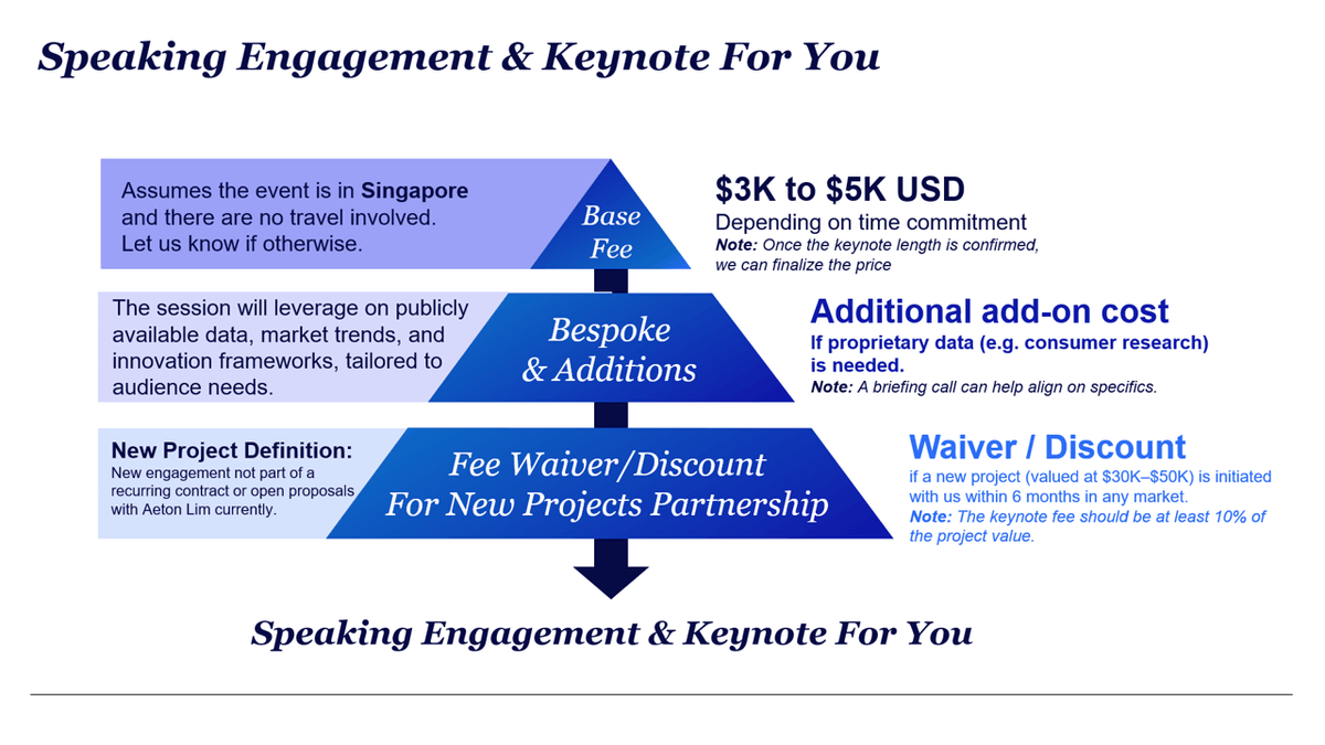 - The base fee will range from $3k to $5k USD, depending on keynote length and assuming no travel requirements outside Singapore.